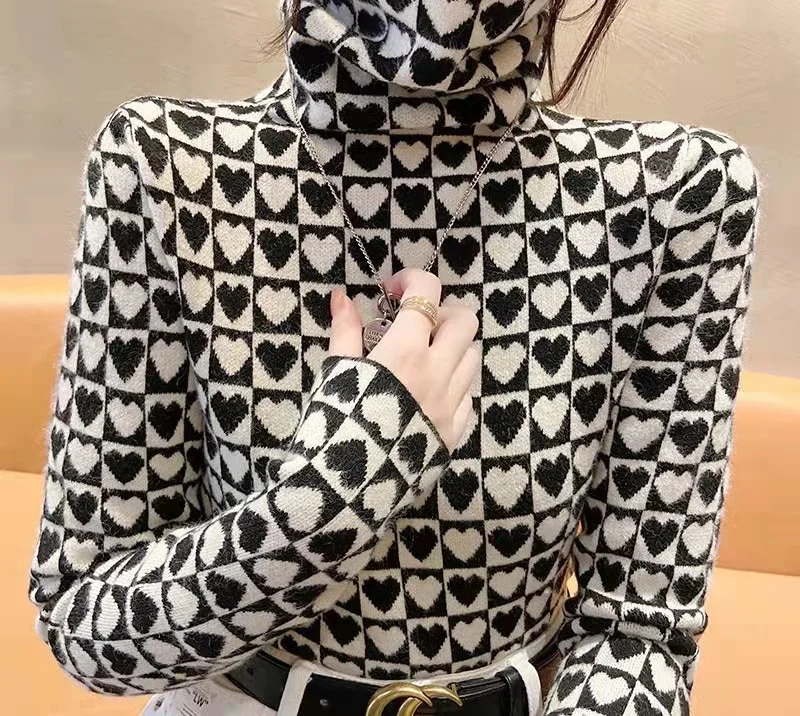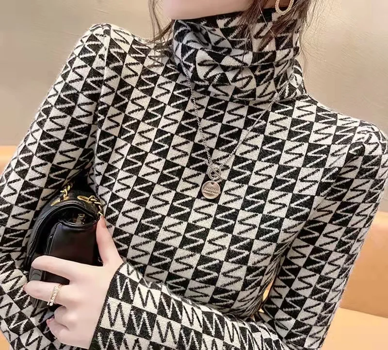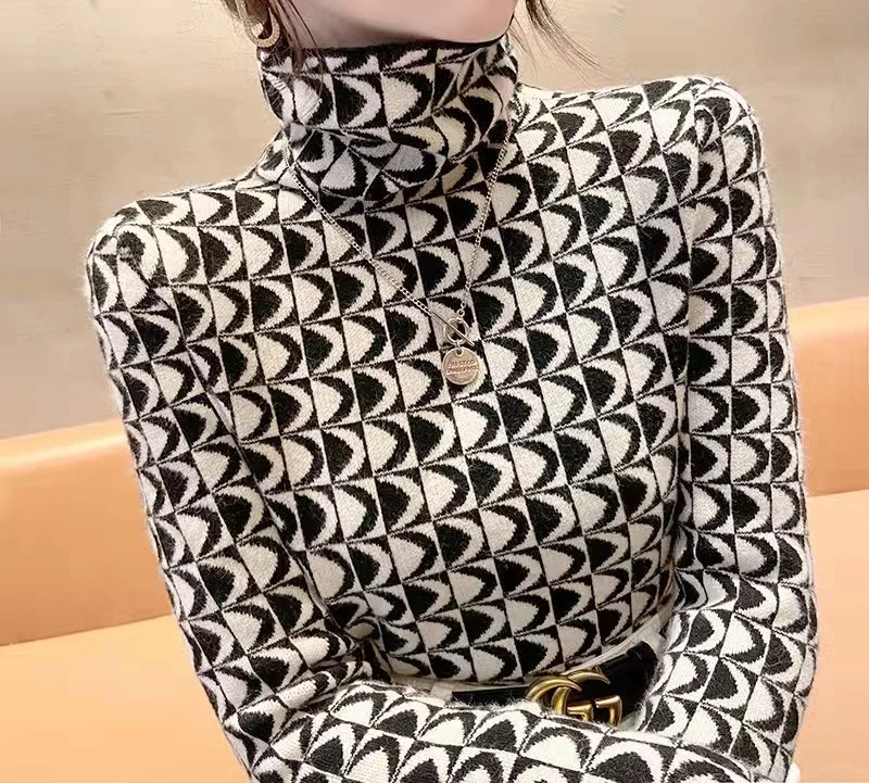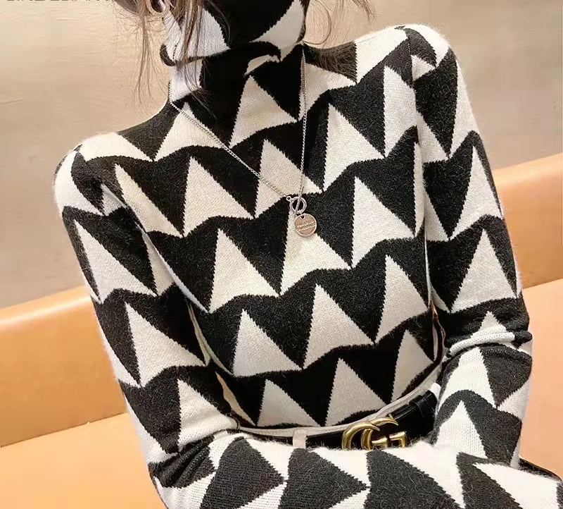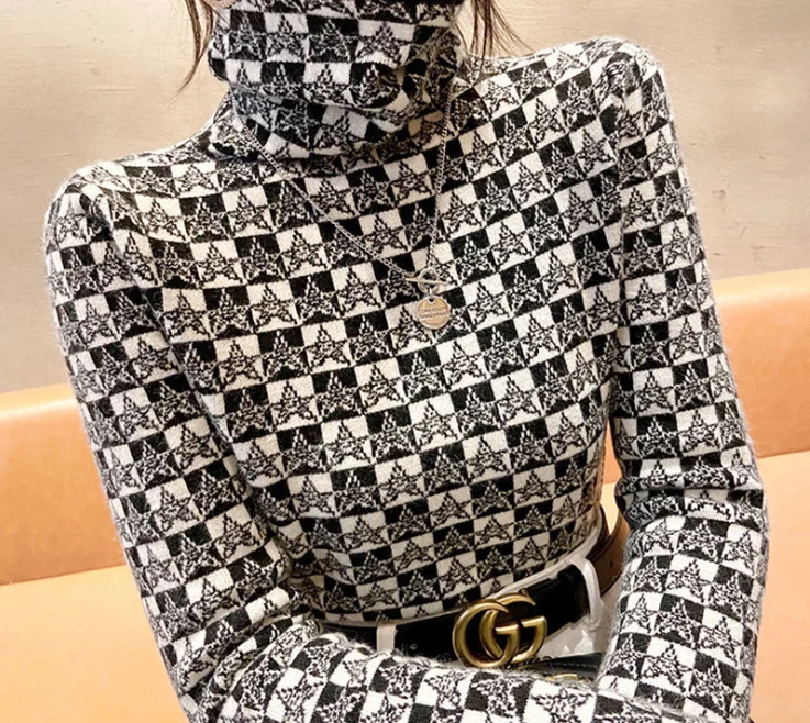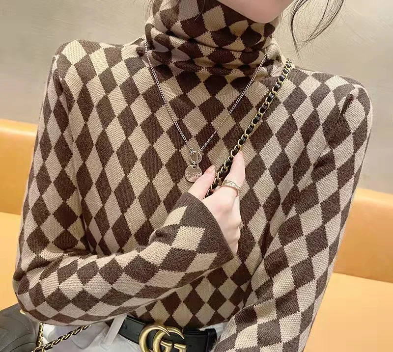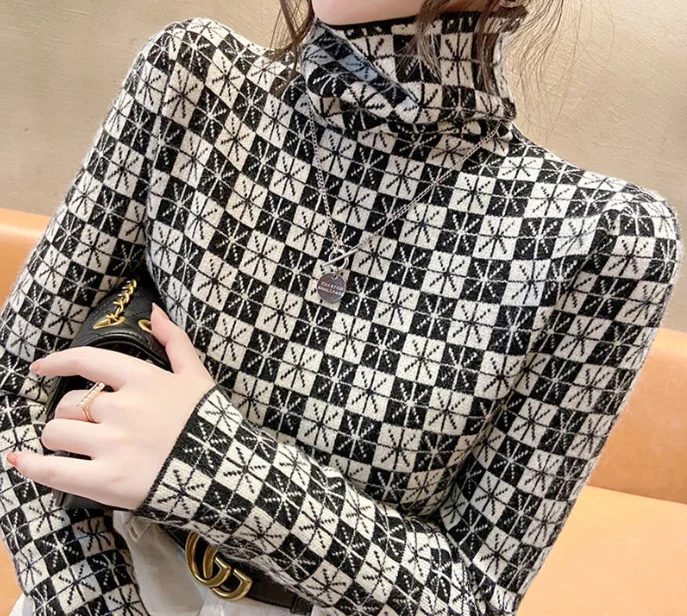 Winter Women's Turtleneck Sweater Korean Fashion Fleece Houndstooth Luxury Sweater Women's Sexy Plaid Pullover Sweater Women